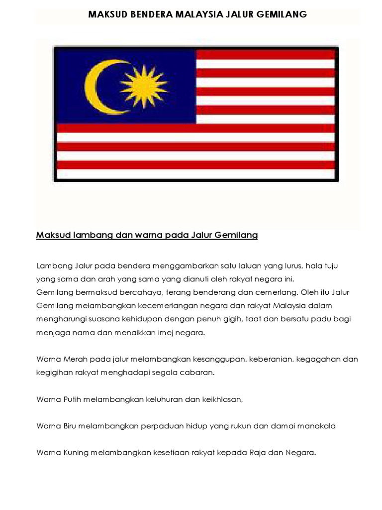 Huraian maksud warna pada bendera Malaysia adalah seperti berikut. بنديرا مليسيا atau nama rasminya Jalur Gemilang Jawi. Jari terketar tak mampu menampar tangannya letih hendak menangani mereka yang bingung di pentas.